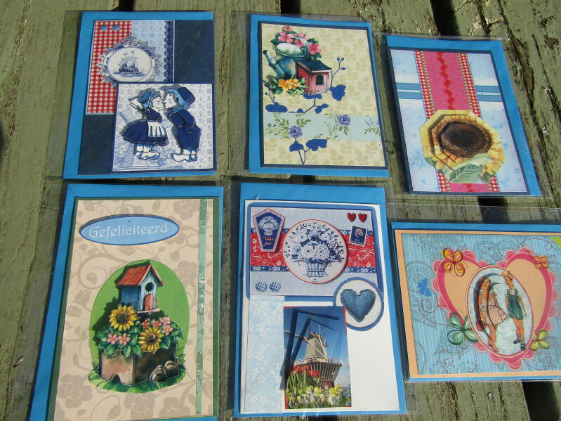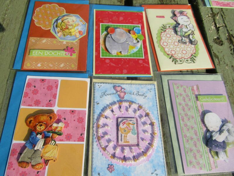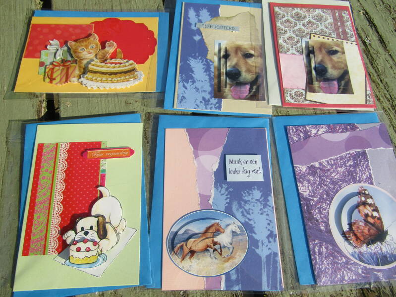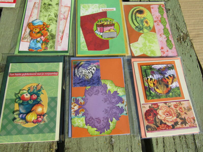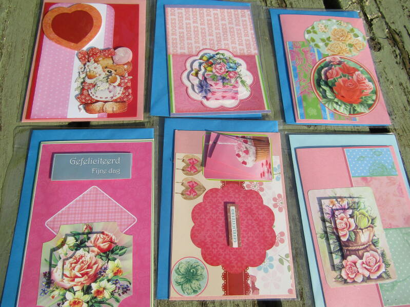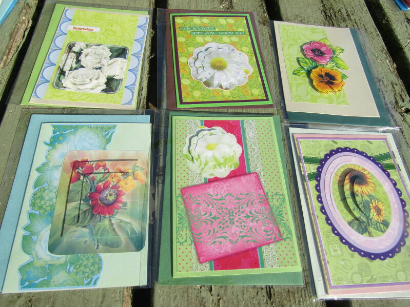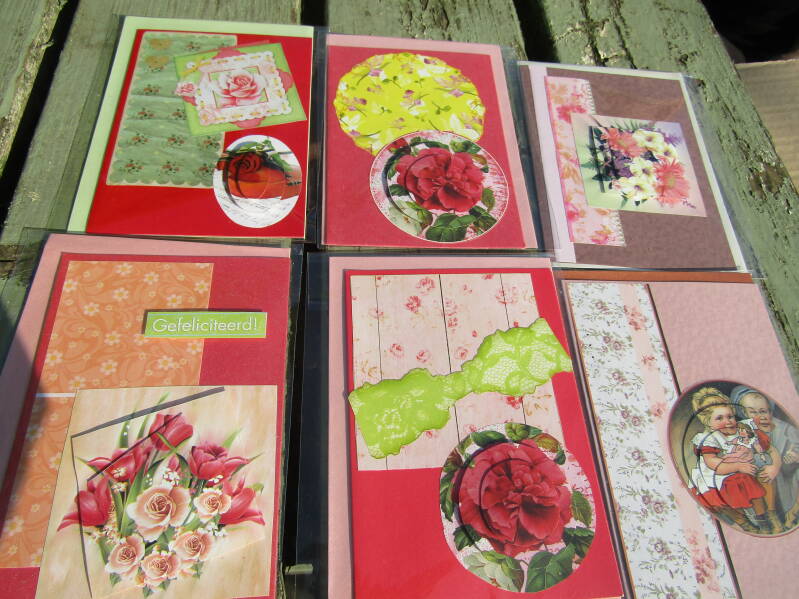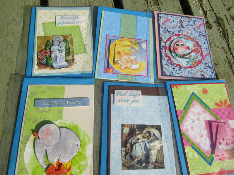 Handgemaakte kaarten 1 euro pst, 6 voor 5 euro en 14 voor 10 euro.