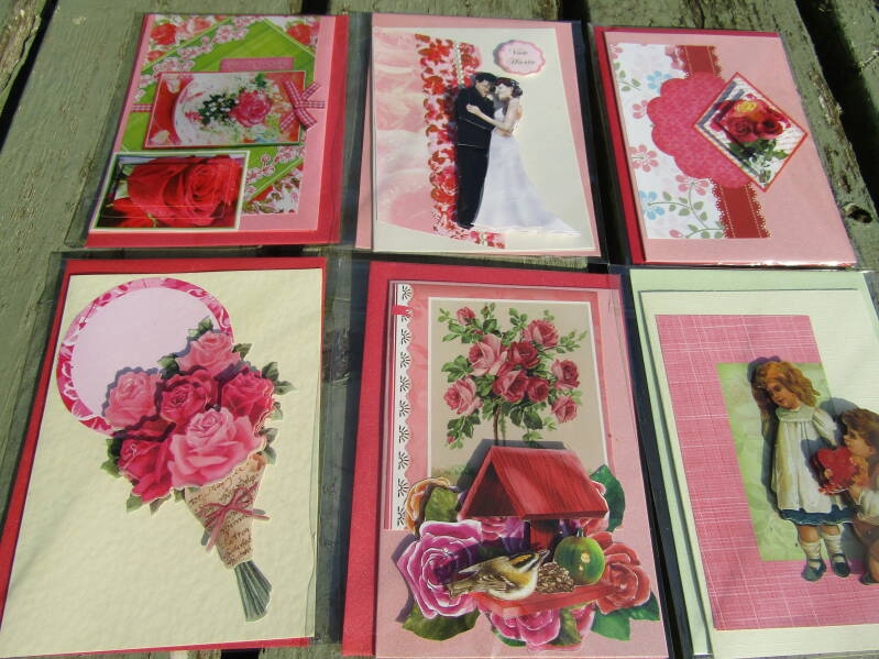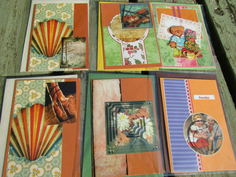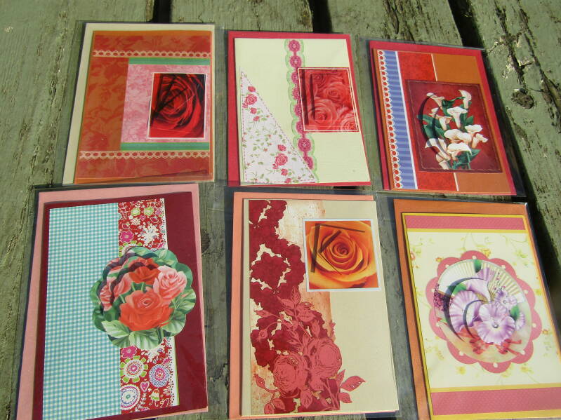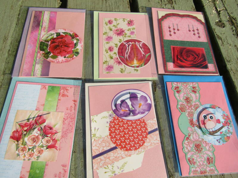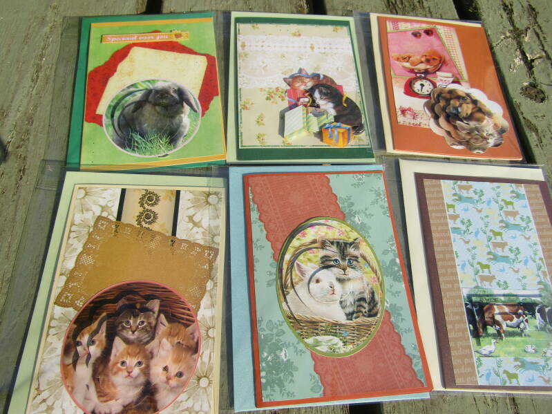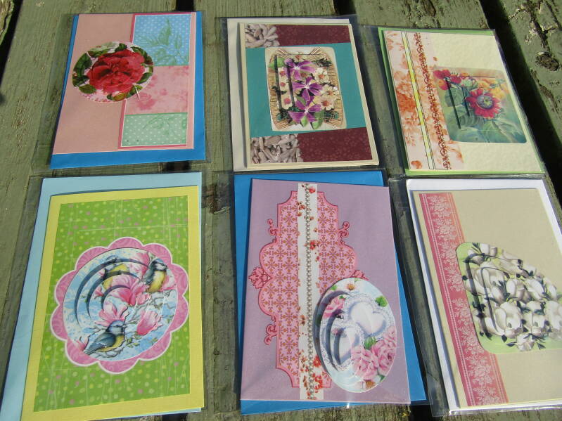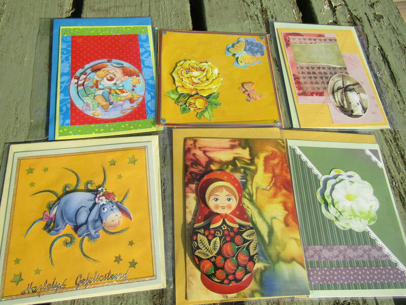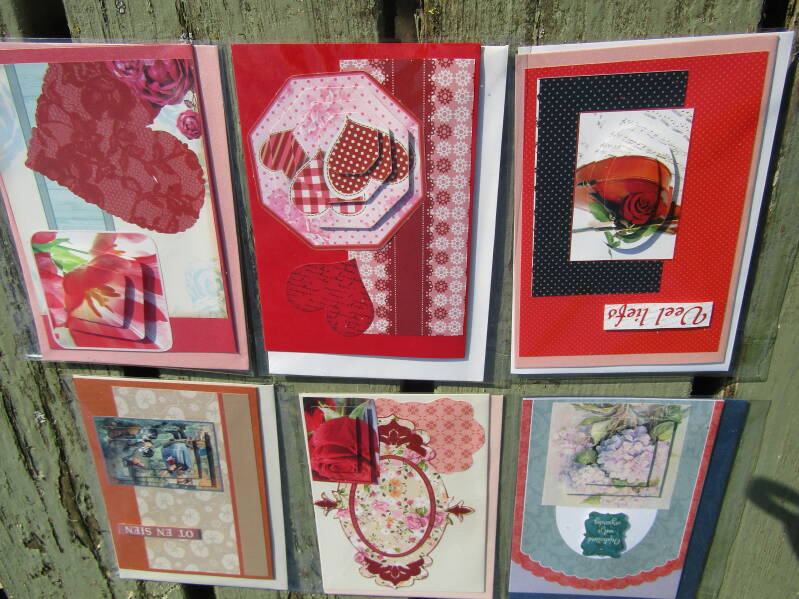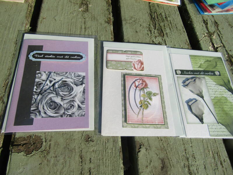Handgemaakte kaarten 1 euro pst, 6 voor 5 euro en 14 voor 10 euro.